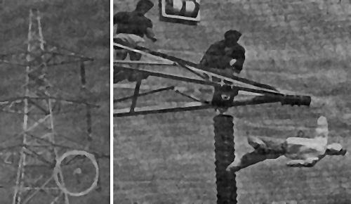 Left, the dummy suspended from the pylon and right, Electricity Department staff removing the dummy from the pylon