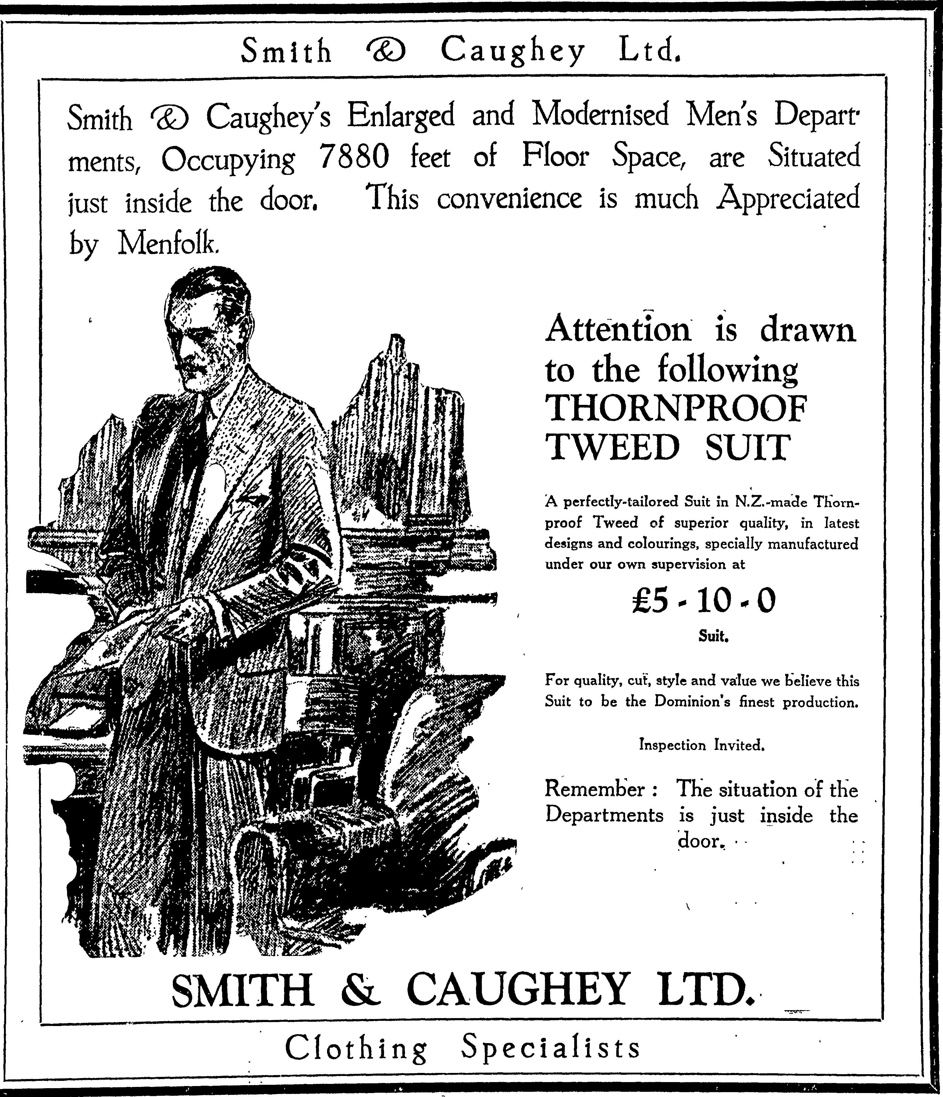 Advertisment for the mens department. Thonproof Tweed Suit for £5-10-0
